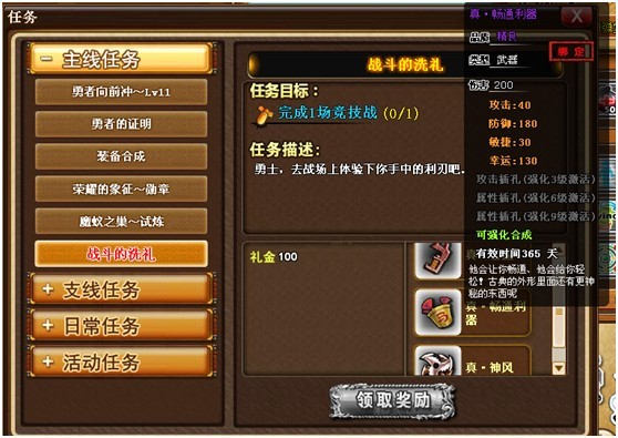 今天闲着无聊,玩起了弹弹堂,咦,N久没玩了,手气还不错,逢战必赢,呵呵,那种感觉令我想起昔日南方不败的我。(本人在南方,Hoho)。然而,天公并不作美,突发事件从天而降------弹友必备的真武器失效了。太可恶,太可悲了,偏偏在如此美好的时刻出现如此的事情,心情如同泄气的气球,再也木心情玩了。于是想找位弹友聊聊,发泄心中不满。刚好看到有位很要好的朋友在线,跟他聊了起来(该朋友是在玩弹弹堂游戏认识,之前声称自己是弹弹堂的GM,不过我不信,跟他笑称自己还是总裁呢。呵呵)。他知道真武器过期一事后,忙劝我不要生气,花言巧语地说在新版本中,真武器可以免费使用365天,这谁信呢?为了消除疑虑,他还把新版本任务界面发给我。为了发泄不快情绪,特发上来给大家look 一look,根据这张图片,完成一场竞技战就能免费获得365天真武器的使用权,究竟是真还是假的啊?难道是运营商为了反馈广大玩家而精心准备的礼物?还是该位弹友PS出来愚弄我?相信时间会证明这一切的。但如果是真的,岂不是我们的福音?武器过期无法战斗的后顾之忧即将结束? 另外,简单明了的任务界面、新增的“活动任务”、下拉功能,这么多新增内容,能够提前大饱眼福,真是回味无穷啊。无限期待中。。。。