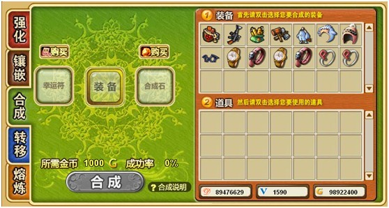 与旧版本铁匠铺不同的是,在新版本的合成功能里,合成石上方添加了“购买”选项,究竟是购买什么呢?装备?道具?还是合成石?难道会有更加优惠的价格?假如真有这功能,那么不会像以前那样繁琐了------须逛商场才能卖到东西,然后才能合成装备,真无聊啊!!!对于经常合成装备的我,省去了那么多事情,真的很期待哦!!!