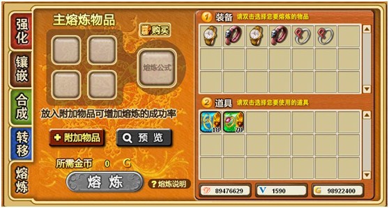 与新版本合成功能一样,新版本在熔炼功能的熔炼公式上面也添加了“购买”选项,这个选项有何用途呢,难道是方便装备、熔炼公式的购买?该不会是降低熔炼的成功率吧?如果降低了成功率,那我就不熔炼,这样的话谁敢玩呢?是吧?再多的猜测,也是浪费时间,不如等新版本出来后,再做定论吧。到时我们只需要拿起鼠标,轻轻一点,真相自然就会大白了。
