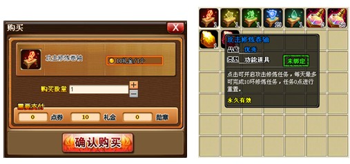 第一,在商城 “礼金区→道具栏“,使用礼金购买修炼卷轴;购买成功后在背包栏中找到已购买的修炼卷轴。