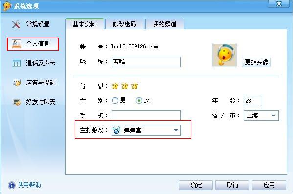 进入以下“系统选项”面板,点击“个人信息”,将主打游戏转换成弹弹堂即可!