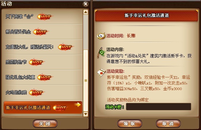 2、点击“新手卡幸运礼包激活通道”,在“活动卡密”处输入新手卡激活账号,单击领取