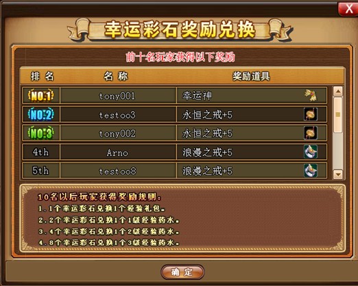 第十名以后的弹友,根据幸运彩石数量,自动兑换经验药水发送。幸运彩石兑换经验药水的方式是,先兑换最高等级药水,剩余石头逐级兑换低级的。举例:如果你有150个幸运彩石,那么你会获得18个3级药水、1个2级药水、1个1级药水(18×8+4+2=150)。