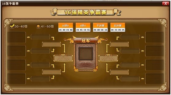 积分排行前16位的,将自动选入十六强争霸赛。对手由系统随机分配,弹友们可以点击“查看16强对阵”图标,来查看参赛人员和赛程表。当然,30-40级和41-50级都会有各自独立的对阵图。