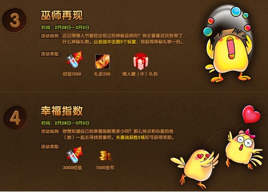 到了二月中,就是一年一度的二月十四日——浪漫情人节了。恋爱中的男女们,欢迎来到IS《弹弹堂》情人节活动现场。这里有相守到老的祝福,有身藏情人节大礼包的神秘巫师,还有能测出与心爱人儿幸福指数的神奇占卜,这个情人节,将让大家终身难忘。