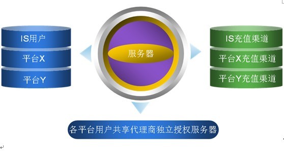 IS用户使用平台通行证,登陆合作方独立授权服务器,使用自身平台充值渠道,并将用户在授权游戏中的消费(充值收入)按一定比例进行分成。