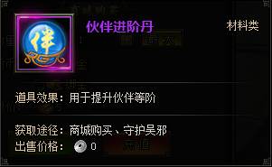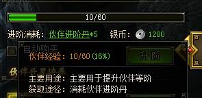 伙伴进阶消耗“伙伴进阶丹”增加伙伴经验值(伙伴等阶越高材料消耗数量越多);