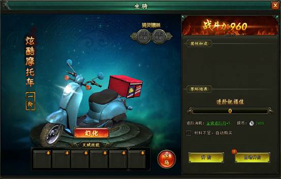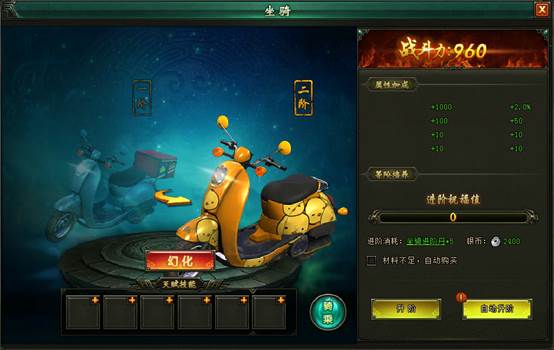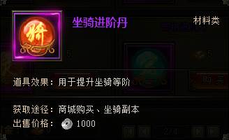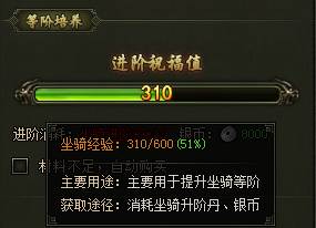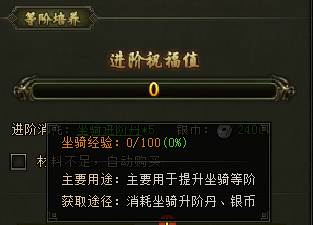 坐骑进阶消耗“坐骑进阶丹”增加进阶值(坐骑等阶越高材料消耗数量越多);