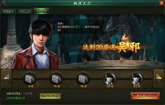 守护吴邪为多层场景,一层为一关,在限定时间内击杀完该层所有怪视为通关,可进入下一层,在该玩法中,NPC“吴邪”会跟随主角一起战斗!