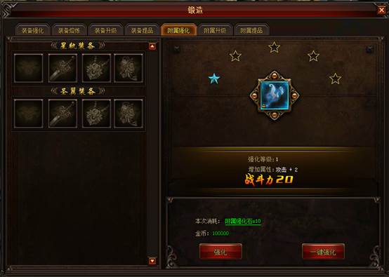 附属装备可通过消耗附属强化石,附属升级石和附属提品石和金币来对附属装备进行锻造。