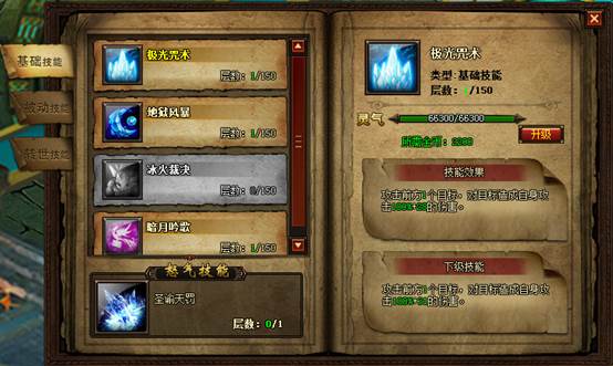 点击技能图标右侧显示该技能的详细信息,技能需要用金币和灵气升级,升级后提升伤害,每个技能最高可升至150层。