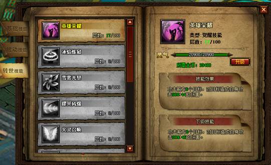 技能分为基础技能,被动技能和转世技能