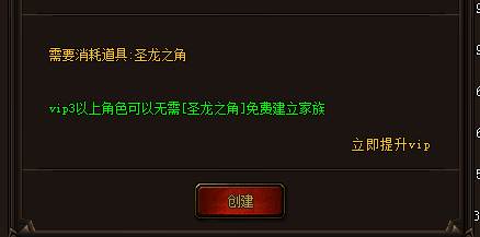 玩家可以选择自己创建公会或加入其它玩家公会。需要注意的是创建家族需要玩家VIP等级达到VIP3才或者消耗道具:圣龙之角才可以。VIP3是可以免费创建家族的哦!
