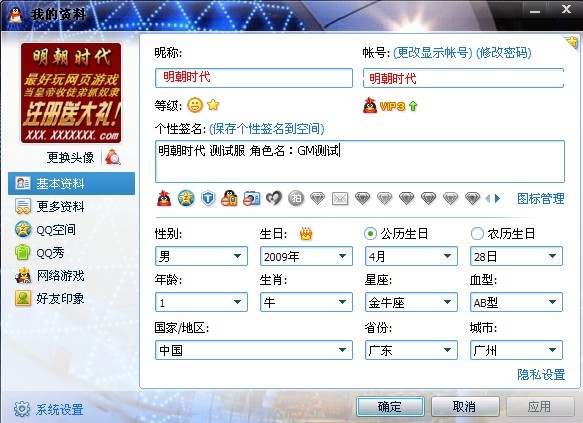 活动报名时间:2010年8月1日0:00--2010年8月7日23:59 活动区服:所有区服 活动对象:所有玩家 活动参与要求: 1、活动开启后,添加官方活动专员QQ 1209063432(报名之日起公布)为好友。 2、拥有1个常用QQ等级必须≥12级(图标为3个月亮) 3、修改并保持头像为以下指定头像:(8选1) 3、在QQ签名处写上:IS《明朝时代》 XX区 角色名:XXX 4、修改头像和签名(如下图所示) >>>>>>收购玩家头像活动专贴<<<<<< 活动奖励: 每人一个价值300元宝的豪华新手礼包 注:玩家的头像和签名必须保持7天,必须按以下图标截图,否则不发放奖励。