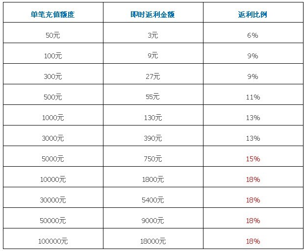绑定手机后玩家在IS游戏内单笔充值满以下金额,即时到账额外返利奖励!