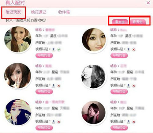 完善个人资料后,查看附近玩家,在附件玩家里可分男生女生,方便大家寻找。选好对象与他,她约会,就能与你相中的人进行第一次交流。