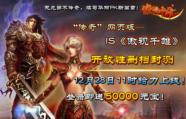 重温传奇经典,延续火热激情!IS游戏岁末给力巨献“传奇”三部曲之第一部——IS《傲视千雄》开放性删档封测将于12月28日11时超给力上线!新特色新体验,引领传奇后续给力旋风!全新神秘地图首次亮相,隐藏绝版装备风靡全服!装备好、升级快、赚钱爽,无需下载,点开即玩!
