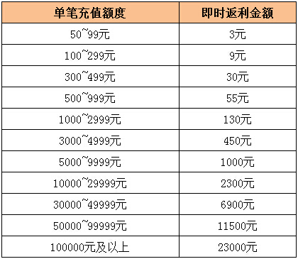 活动规则:活动期间,玩家在IS游戏内单笔充值满以下金额(以游戏内实际到账金额计),即时到账额外返利奖励!