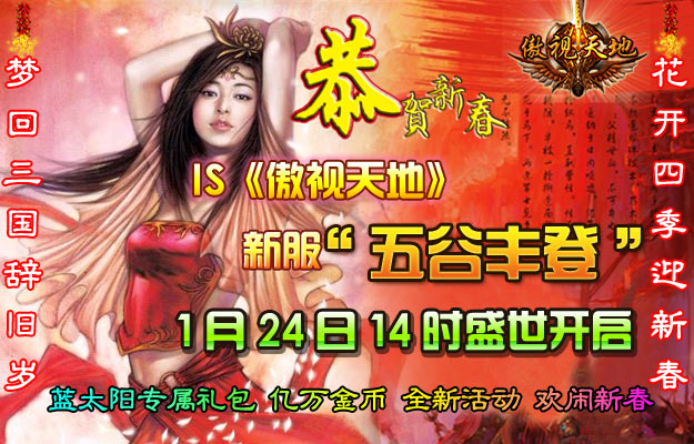 IS《傲视天地》深受广大玩家的热爱与支持,在线的人数屡创新高。为了欢迎更多玩家可以体验到斩黄巾英雄首立功、破关兵三英战吕布等等的烽火四起的激斗战争场面。在2011新春前夕,IS《傲视天地》官网决定于2011年1月24日14:00震撼推出新服——五谷丰登!