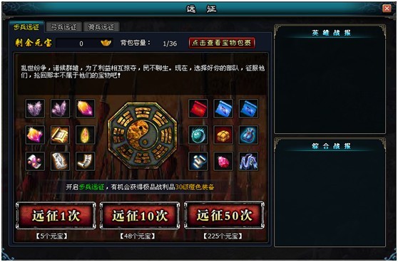 IS游戏兔年巨献武侠经典之作ARPG页游,IS《英雄远征》即将强势登陆I游休闲平台。期待你的加入!超华丽的技能画面,即时操作的技能招术,神秘刺激的副本探险,让你充分体验秦、楚、汉时期的乱世震撼! IS《英雄远征》是一款英雄纯武侠式角色扮演,以秦、楚、汉为时代背景,集策略、冒险、探险等多种游戏元素为一体的即时战斗网页游戏。 封测公会入驻大招募>>>>>> 特色系统抢先看 【国家鼎立 RPG&SLG完美交汇】 IS《英雄远征》中一共设立了秦楚汉三个国家,极具传奇色彩的朝代将给广大玩家一次深刻的文化洗礼。并且攻城战斗已经开放,未来以国家为单位的国战系统指日可待,正因为如此,WEBGAME首次实现了角色扮演和战争策略的完美交汇,玩家在游戏中可以同时体验两种类型的风格,这算是巨大的突破。 【温泉系统】 天上人家,冬日温泉。这是玩家们的休憩之所,IS《英雄远征》独一无二的开放式温泉,无论任何职业、任何等级的玩家都可参与;这里还是可以远征的神秘宝库,周游小岛,饮酒作乐,在无尽的享受同时还可获得大额经验;喝酒聊天领着经验,看着穿着比基尼的姑娘们,徜徉在此,神仙般的享受。 【远征系统】 三种不同场景的远征系统——步兵远征,弓兵远征,骑兵远征,不同装备掉落!高级橙色装备,橙色鉴定石,高级流星铁、百练钢,高级符,大型经验丹,经脉、宠物保护符,大型铜币卡,1~3级镶嵌石……丰厚道具丰厚奖励哗哗掉落,看你能否尽收囊中! 【钱多多副本】 钱氏家族自古以来赚钱有方,累积了众多财富,但纷争的乱世,匪类纷纷打起了他们财富的注意,为了寻得能人异士保护宝藏,他们的家族长特命人建立小金库。不管是谁,只要能过了他们设下的障碍,就有机会成为他们家族的财富守卫,更能获得小金库的财富,作为报酬!在游戏中,只要有实力,钱不是问题,至于能挖取多少财富,就得看英雄们的能耐了!