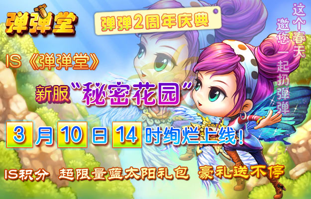 伴随着战斗中的欢笑和乐趣,伴随着朋友之间的友情,与“TA”之间的爱情,弹弹堂2周岁了,在此,特别感谢各位玩家对弹弹堂的支持和厚爱,特开放周年庆系列活动,回馈玩家—IS《弹弹堂》新服“秘密花园”3月10日14时绚烂上线!!