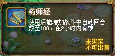 5、药师经:使用后2小时内,自动战斗回合数增加到180回合。(使用后,效果消失前不能再使用其他两种经书)