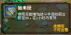 4、如来经:使用后1小时内,自动战斗回合数增加到99回合。(使用后,效果消失前不能再使用其他两种经书)