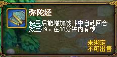 3、弥陀经:使用后30分钟内,自动战斗回合数增加到49回合。(使用后,效果消失前不能再使用其他两种经书)