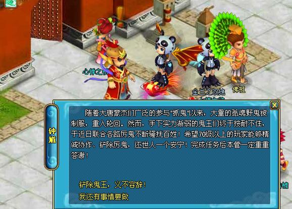 钟馗借助大唐子民之手铲除世间孤魂野鬼以来,大量的孤魂野鬼被制服,重入轮回。手下实力渐弱的鬼王们,终于按耐不住,确定反戈一击!鬼王率领各类高阶厉鬼纷纷出击骚扰世人,以争取在这场斗争中获取最终的胜利!然而,得到风声的钟馗也终于开始了特别的行动。70级以上玩家可以组队一起攻打鬼王,该任务的经验奖励,双倍有效。每天完成全部鬼王任务后有机会获得飞宠经验书初级,做完每周任务还将有机会获得60级套装符文四种每种的武器、铠甲、腰带、鞋子四种随机部位