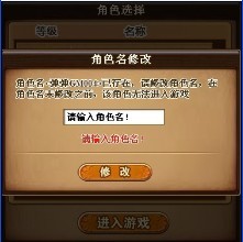 玩家选择重名角色后点击进入按钮则弹出修改呢称的对话框,重新输入新的呢称后点击进入按钮即可进入游戏(角色名修改规则同角色新建时的角色名输入规则)。