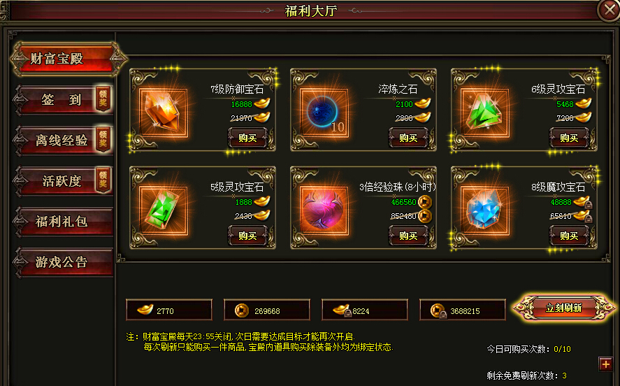 活跃度达到50,即可在财富宝殿购买。绝对的低价,绝对的超值。还能刷出可用绑元、绑金、金币购买的道具。