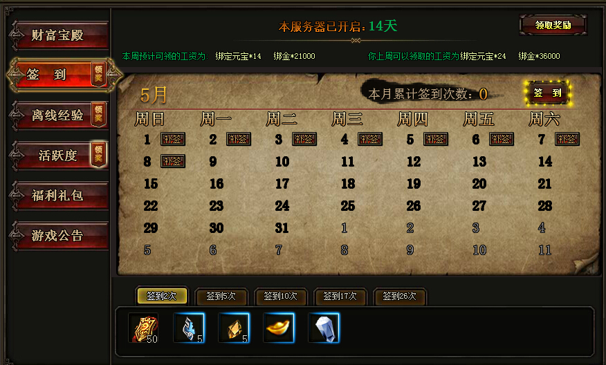打开主界面福利大厅就可以看到签到领奖系统,签到次数越多,玩家获得奖励越丰富。(签到礼包)VIP玩家还可以使用补签功能来你不漏签的天数。