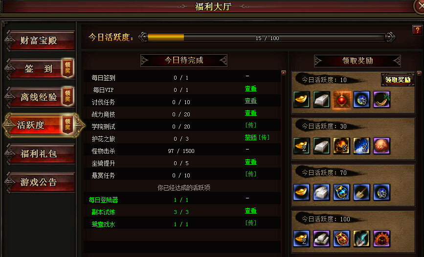 每天完成任务,活动等会有活跃度奖励可领取。珍惜道具、等你来拿。绑金和转生灵魂重要来源之一。