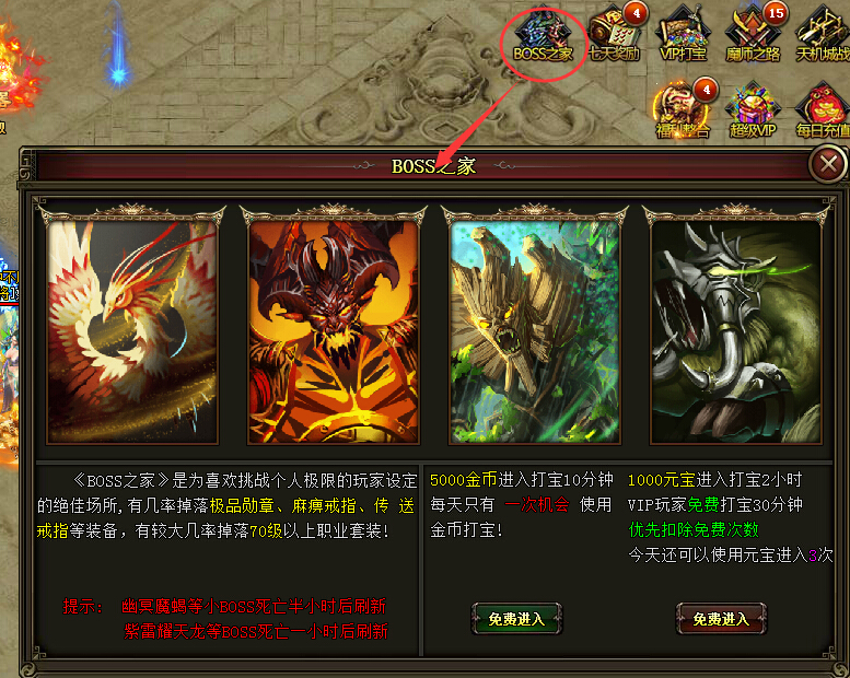 《酒神》为大家准备了丰富的挑战boss,另外还有boss之家,宝宝再也不用担心打不到boss了!
