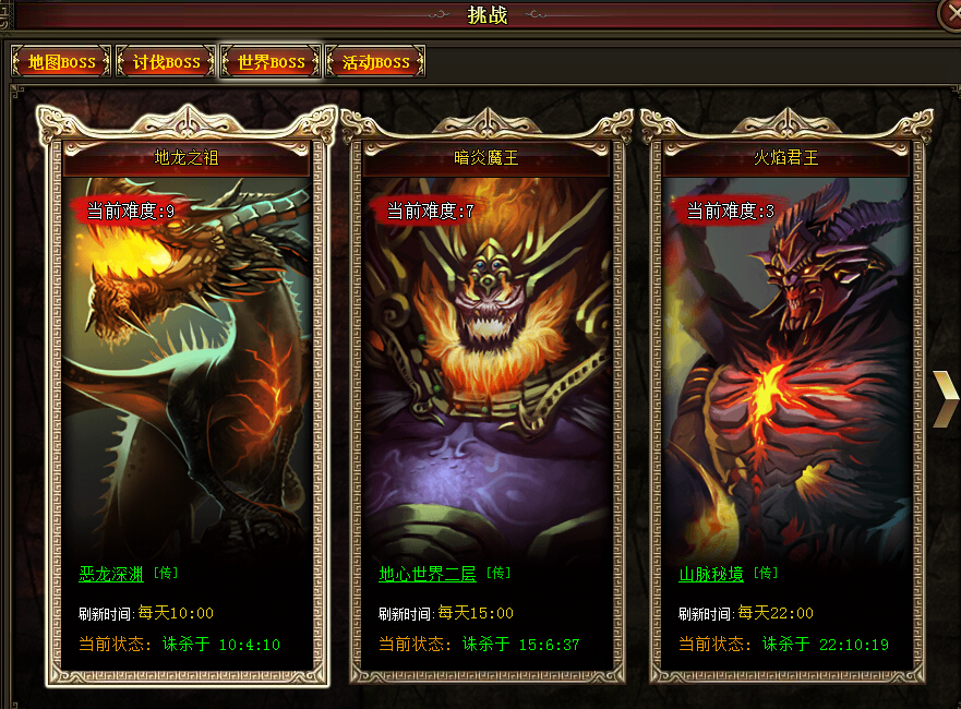 俗称“野外boss”,根据boss的等级有不同的刷新时间,并掉落不同的奖励。玩家可根据自己的实力和需求选择性的击杀。另外野外boss的等级会根据被击杀的次数进行成长,等级越高越难打,当然掉落也越佳。