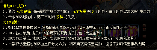 2. 玩家累积对BOSS造成10W伤害即可获得30万经验,2万绑定金币