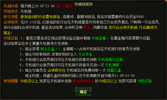 1. 攻城时间是8点准时开启 ,开启之前可以速传到天机城。