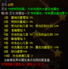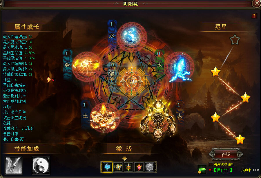 阴阳冕激活可通过吞噬道具“青砖”来让阴阳冕等级提升冕星。阴阳冕分为金、木、水、火、土。当金、木、水、火、土升到5级时,会冲冠永久得到混沌之力。激活金、木、水、火、土可获得不同效果加层和炫酷的外观。