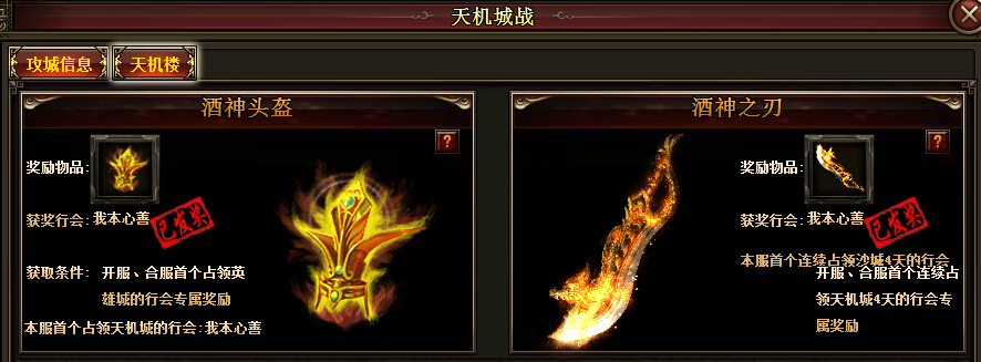 一、通过完成天机城攻城战,获胜方行会会长将能获得酒神之刃和酒神头盔的装备奖励。