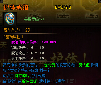 护体戒指:佩戴时角色受到伤害,一定比例的伤害由魔法值抵消