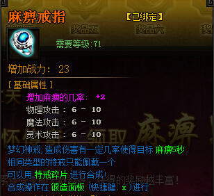 麻痹戒指:佩戴时角色攻击,有一定机率让人麻痹5秒,无法动弹