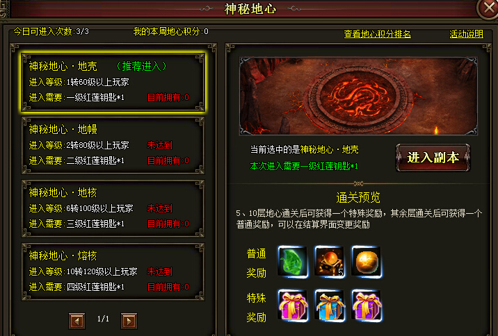 副本介绍:神秘地心为烈焰的世界、每一个神秘地心里面都有10层。