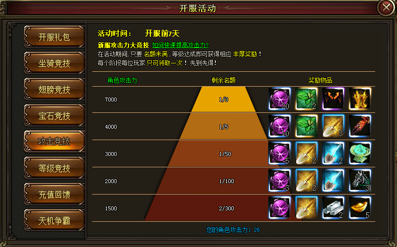 只要你人物攻击力达到条件,均可领取以上奖励,奖励有限,先到先得,过期无效!