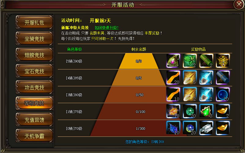 只要你人物等级达到条件,均可领取以上奖励,奖励有限,先到先得,过期无效!