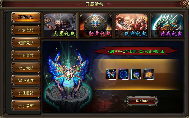 天罡礼包:酷炫的翅膀,不仅让人物焕然一新,还大大的增强人物属性,各种升级材料大放送!若天罡礼包无法满足您的需求,我们已精心准备三款礼包供君选择!