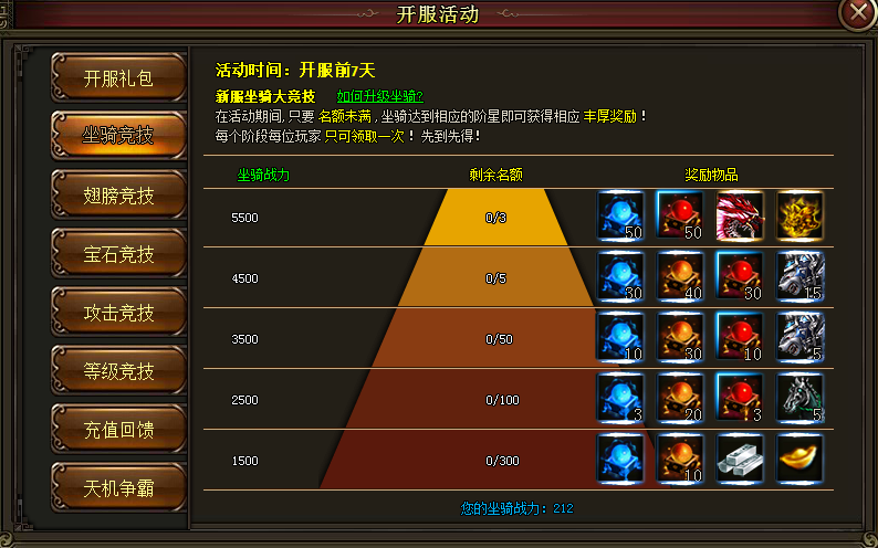 只要你坐骑战力达到条件,均可领取以上奖励,奖励有限,先到先得,过期无效!