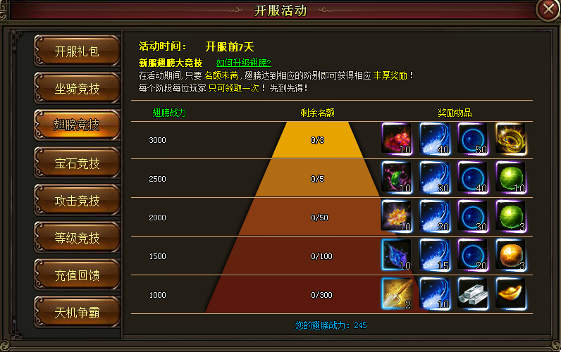 只要你翅膀战力达到条件,均可领取以上奖励,奖励有限,先到先得,过期无效!