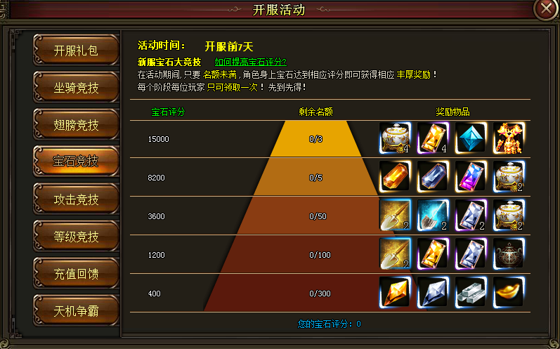 只要你宝石评分达到条件,均可领取以上奖励,奖励有限,先到先得,过期无效!