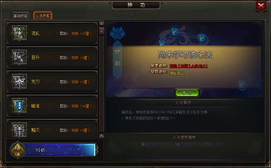 《剑侠伏魔录》人物所有神功都是通过玩家角色等级解锁的。人在江湖漂,没有技能就挨刀,为了不挨刀,就努力升级学习技能吧,骚年!