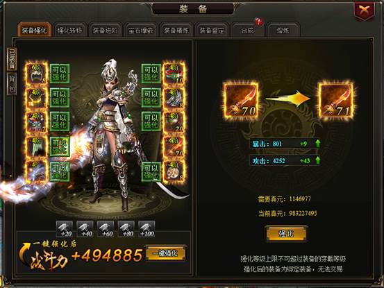 装备强化是快速提升战力的一个重要途径,装备强化上限等于当前装备的等级穿戴上限,只要有足够的真元,很快就难获得全套顶级强化的装备哦!